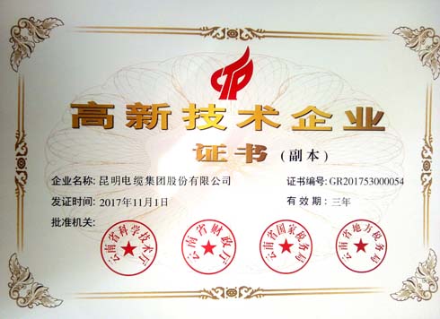 2017年12月,昆明電纜集團股份有限公司再次通過了高新技術企業的認定,被云南省科學技術廳、云南省財政廳、云南省國家稅務局、云南省地方稅務局認定為“高新技術企業”。